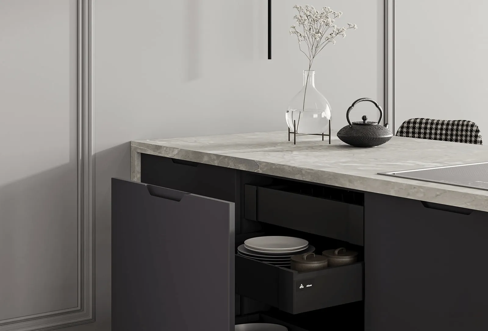 Однако, красота этой кухни не ограничивается только ее внешним видом. Каждый элемент этой кухни был продуман до мельчайших деталей с учетом функциональности и практичности использования. Шкафы и ящики оснащены системами плавного закрывания от HETTICH, что предотвращает неприятные звуки и обеспечивает долгий срок службы.