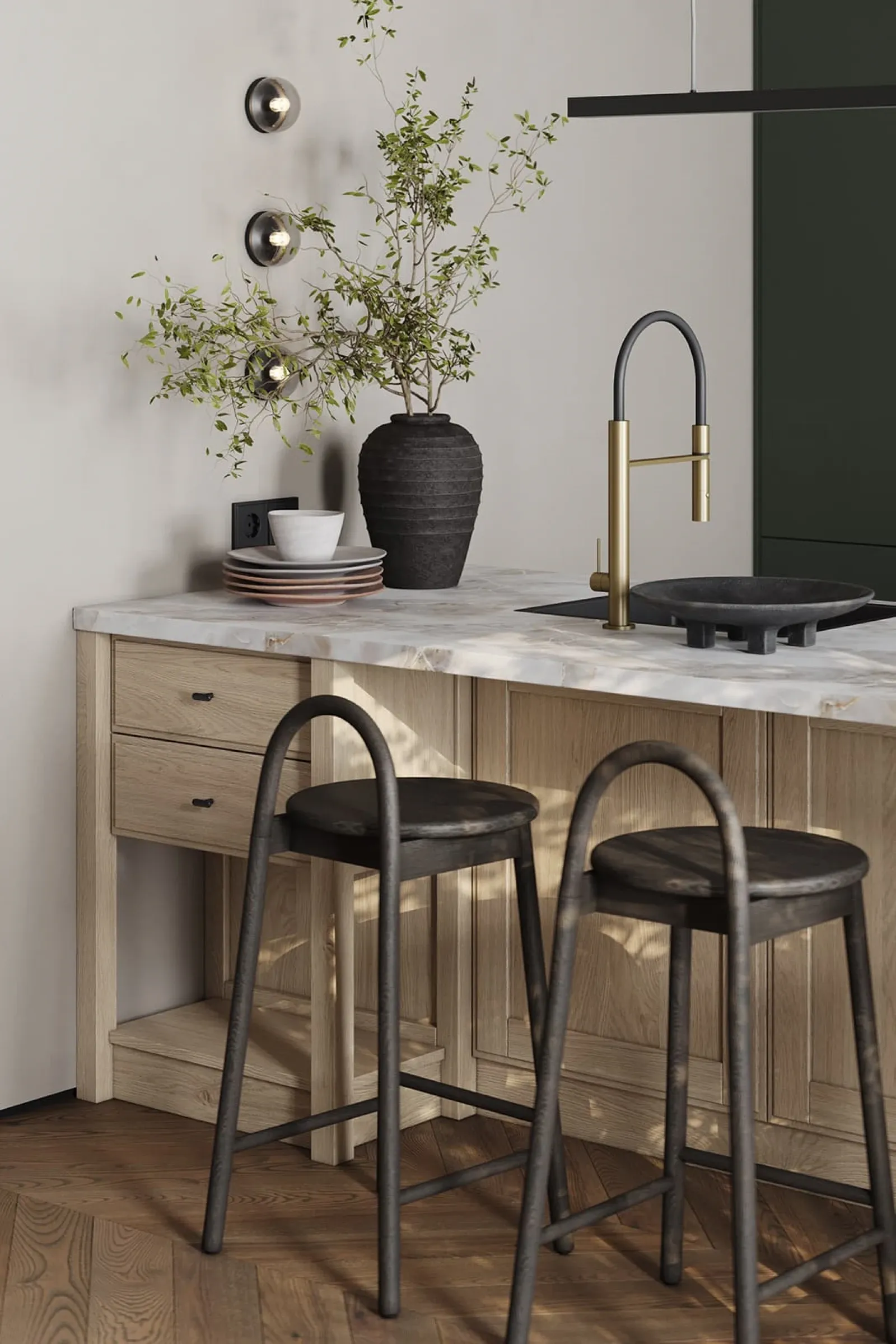 Фасады: Т737 Натуральный дуб, цвет #189 (воскобейц Белый) / ЛМДФ EVOSOFT, цвет Сумрачный Нефрит