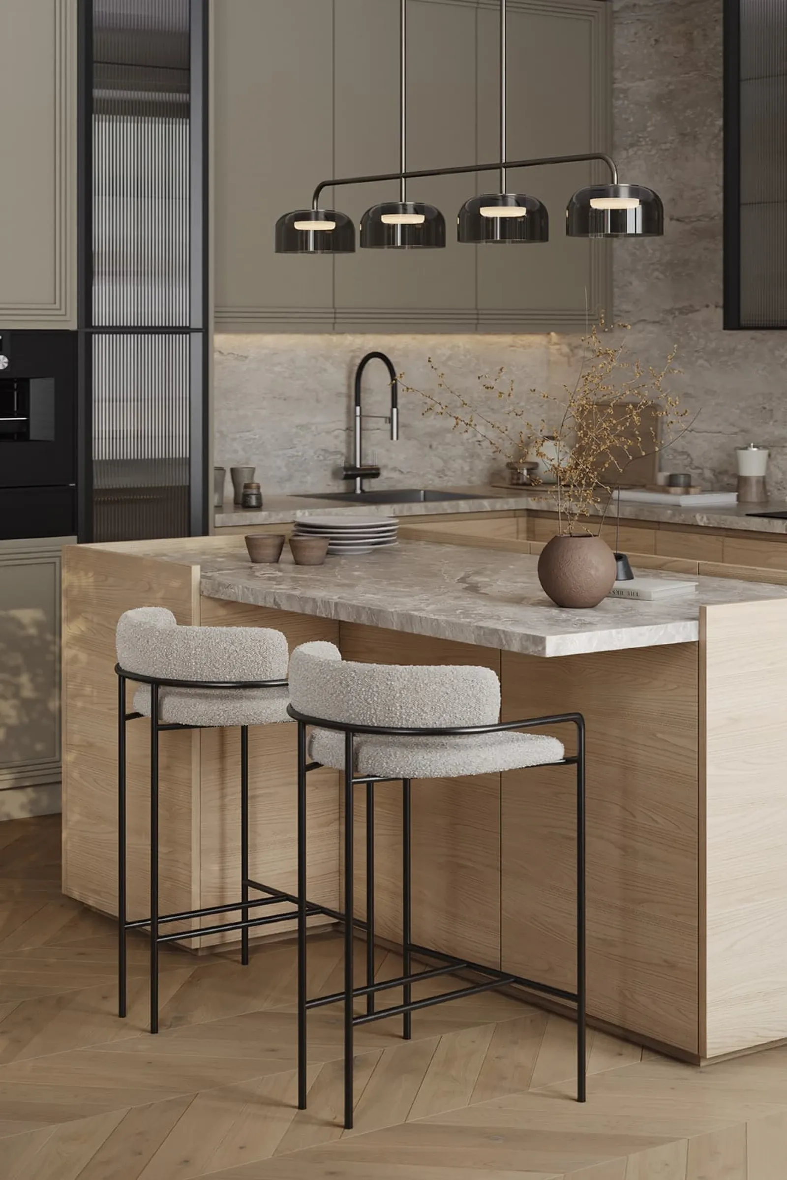 Фасады: Т422 / Т419Г Шпон дуба, цвет #183 (масловоск Бесцветный) / Т650 Крашеная МДФ, цвет NCS S 4005-G80Y Матовый