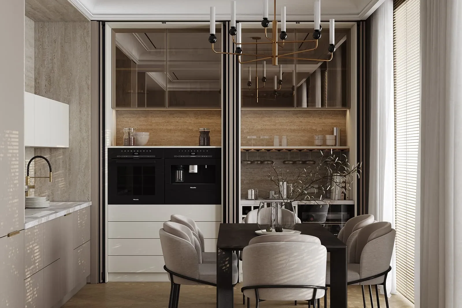 Витрины: Алюминиевый профиль А-6 Латунь (скрытая петля AIR PUSH), стекло Феникс Бронза