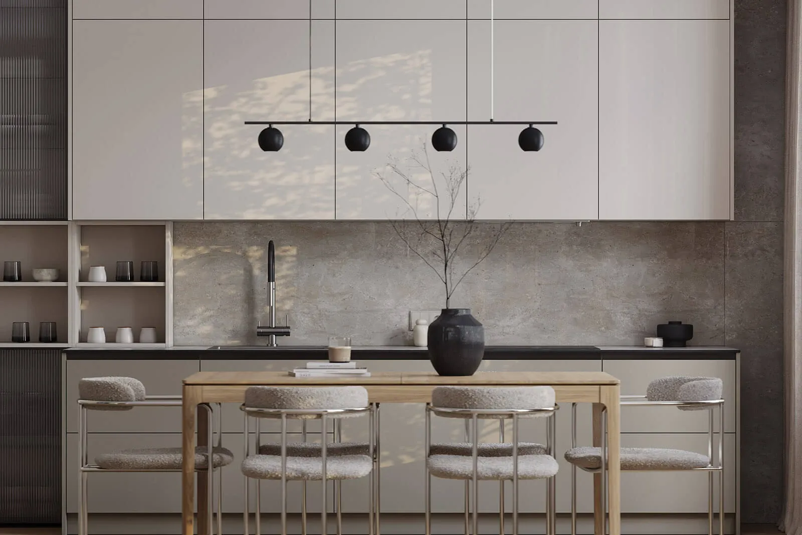 Витрины: Алюминиевый профиль А-6 Черный Матовый (скрытая петля AIR PUSH), стекло Тисненое-4 Графит прозрачное