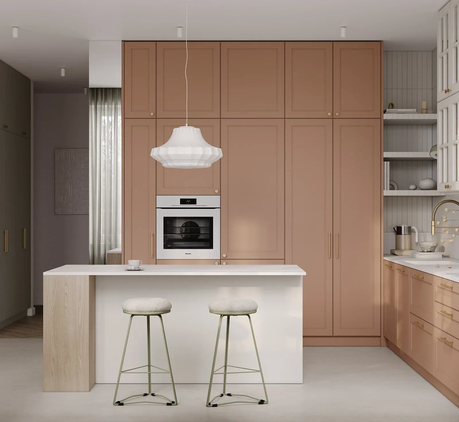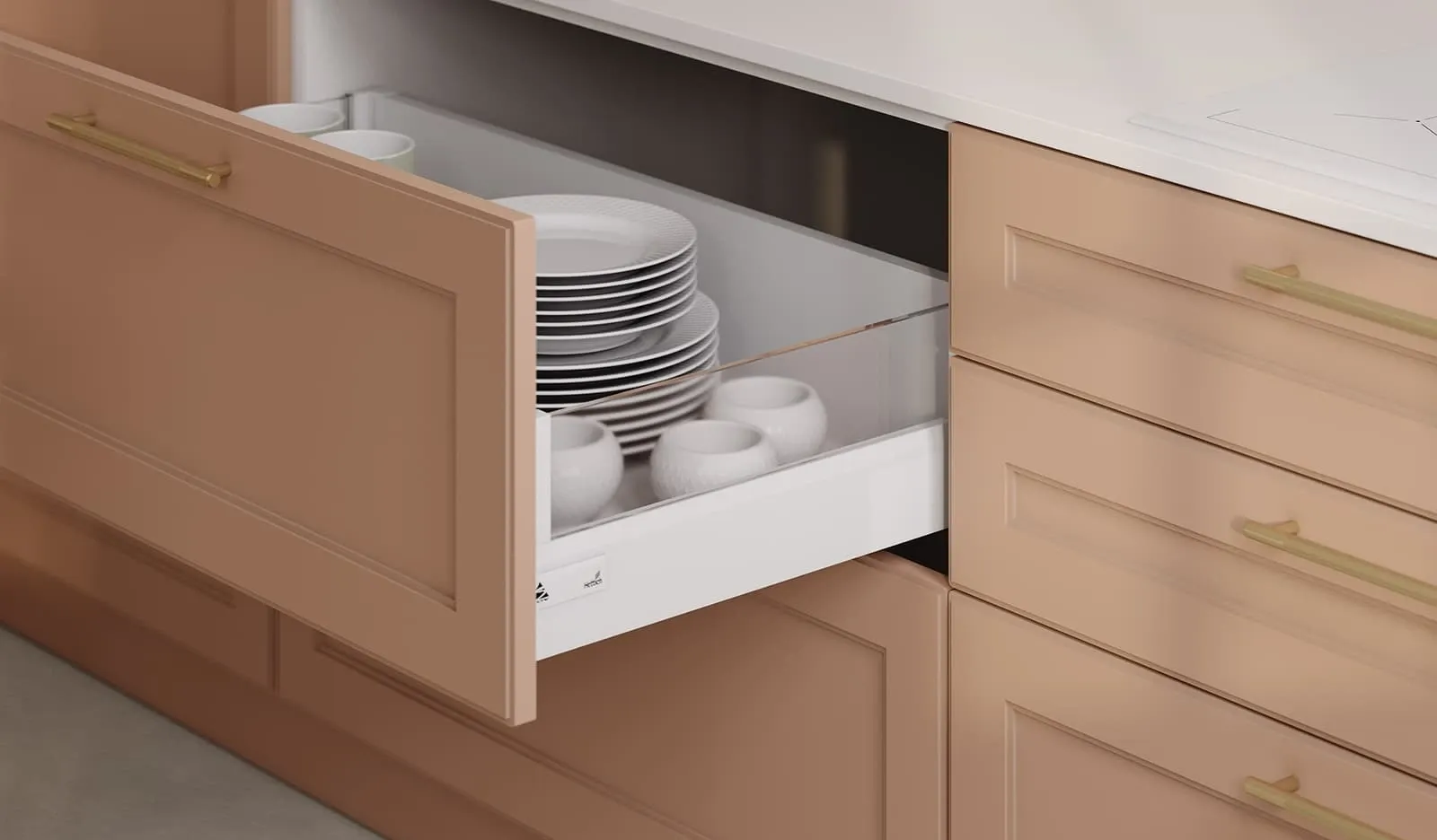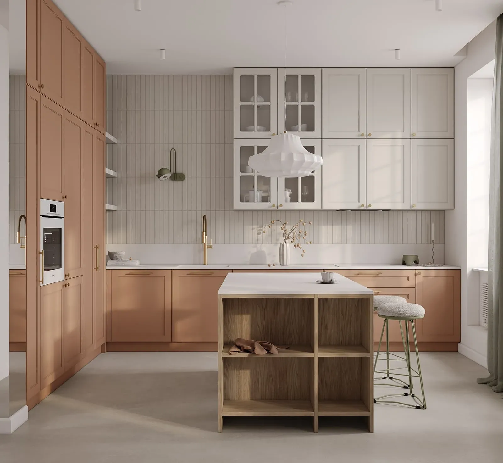 ФАСАДЫ Омега (крашеная МДФ), цвет NCS S 3020-Y50R Матовый / NCS S 1002-Y Матовый СТОЛЕШНИЦА Акрил Fenix NTM, 20 мм, цвет Белый NTM (0032)