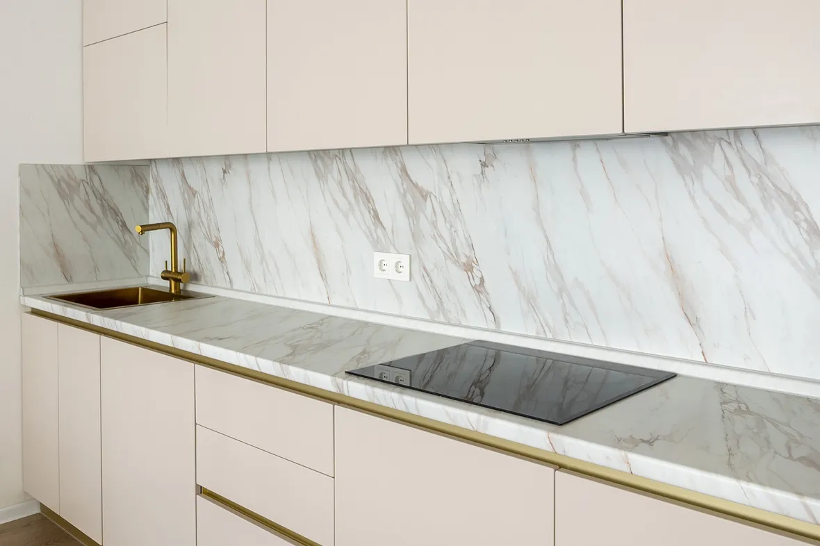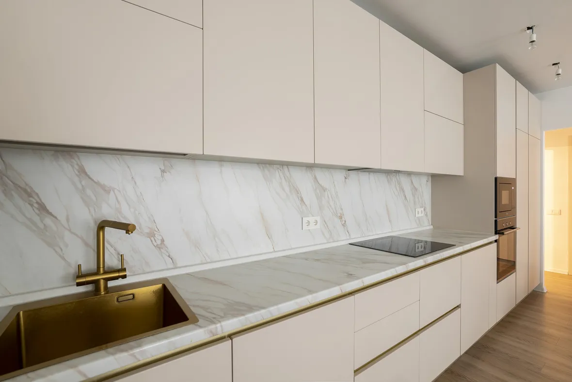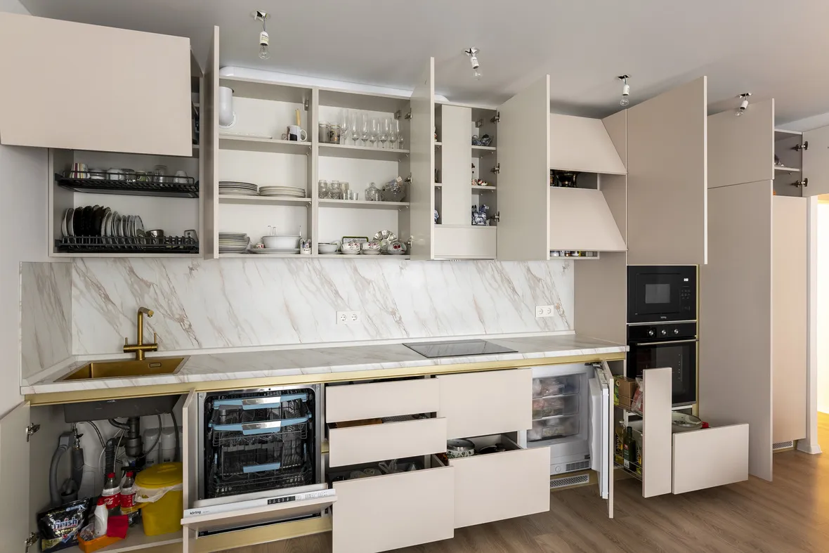 Техника: встроенный духовой шкаф, встроенная электрическая варочная панель, встроенная СВЧ, встроенная ПММ - KORTING, встроенная вытяжка - EVELUX, мойка и смеситель - EMAR